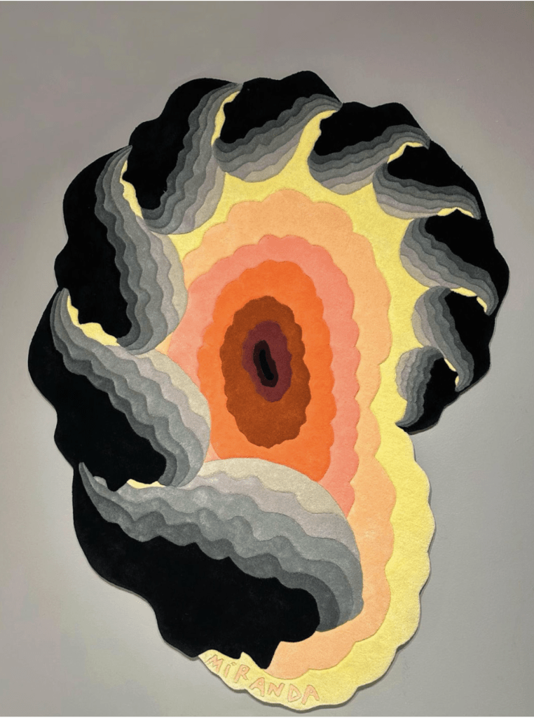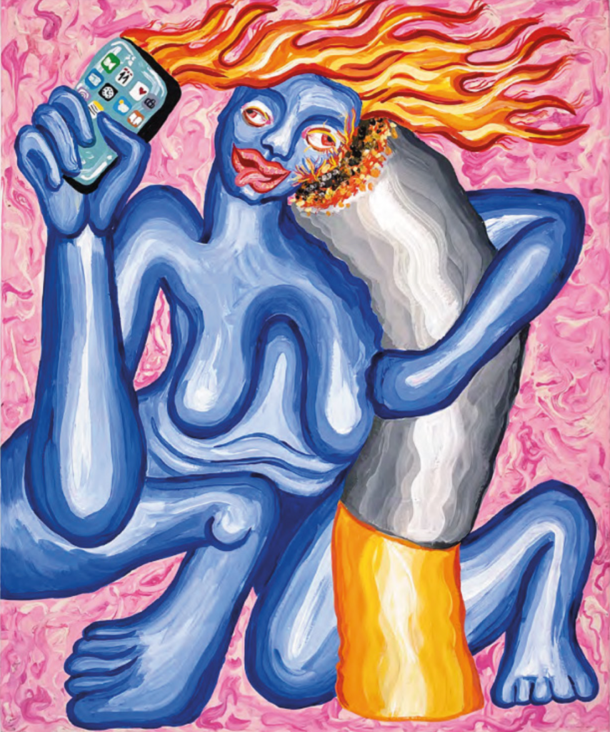 Miranda Makaroff es una artista que no pasa inadvertida. En esta ocasión, la barcelonesa ha participado en la exhibición de la Cerquone Gallery demostrando sus habilidades multidisciplinares con dos cuadros en acrílico y un tapiz bordado con lana. Eugenia nos cuenta que lo que Miranda ha querido representar con su bordado son las voces internas que residen dentro de su cabeza en el momento en que sus pensamientos se convierten en una espiral sin salida. En sus cuadros ‘Trambolic Summer’ y ‘Veta Vacue’ (2022) podemos identificar un cigarrillo y un teléfono móvil, símbolos de lo que se podría considerar como terrores cotidianos que pasan desapercibidos pero que calan en nuestro estado de ánimo.