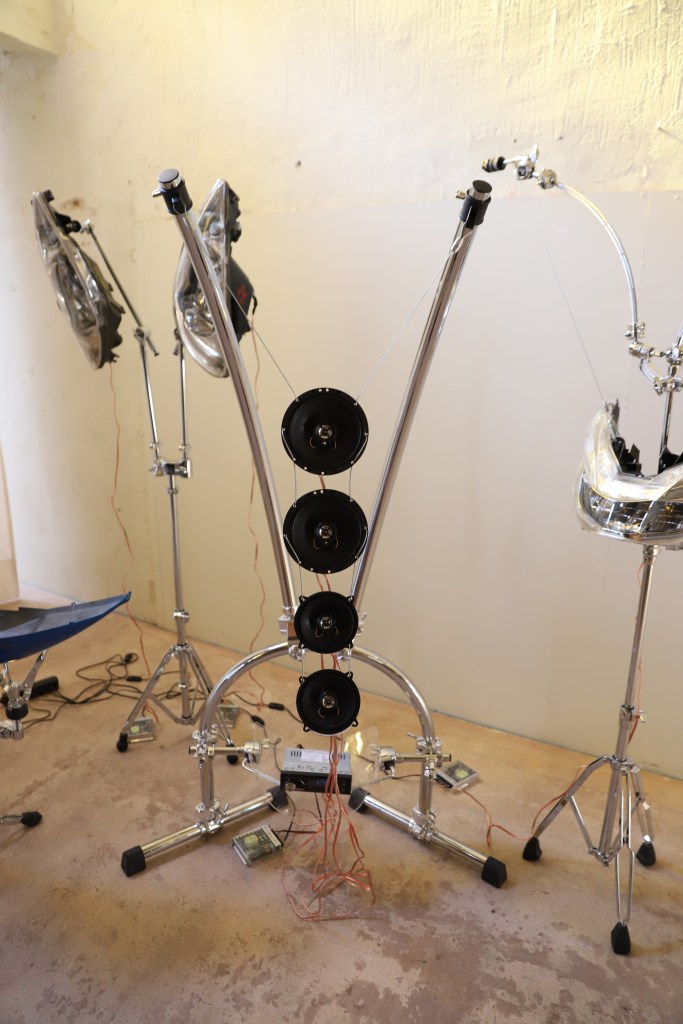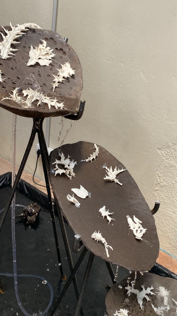 Entre otras piezas expuestas en este ciclo de sueños húmedos destaca, en la fase 3, la escultura “Astroflor” de Clara Álvarez, obra de un trabajo en el que se ha combinado el hierro con la porcelana en el que destaca una técnica por la que Clara ha inmersionado cardos en una receta de porcelana y papel para después meter estas pequeñas piezas en el horno y constituir una especie de caparazón blanco con la forma del cardo. La idea que transmite este proceso experimental trata sobre la naturaleza defensiva: «los cardos proliferan en terrenos donde la naturaleza no está ordenada y sigue sus propias leyes, pero hay muchas de estas plantas que están en peligro de extinción». «La obra simboliza dos plantas que se desean -un cardo y una planta carnívora- pero que están a punto de desaparecer». En la pieza de Clara, un chorro de agua fluye por las diferentes capas y una niebla es generada por ultrasonido. Con todo, “Astroflor” representa las estructuras defensivas de una naturaleza que desarrolla mecanismos punzantes para esconder una vulnerabilidad.