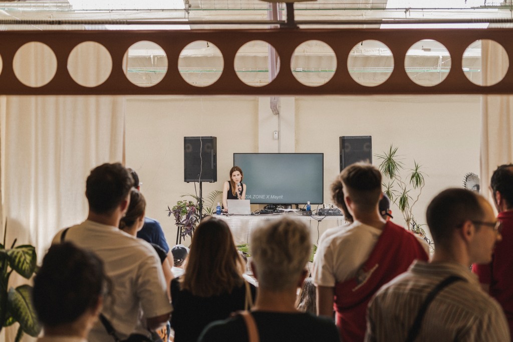 Por la tarde, Inizia.Zone trajo a dos referentes del diseño para dar charlas: Elena Rocabert y Peter Sposito. En el caso de Elena, ella ha traído al espacio Lahipoteca un discurso al que ha llamado “Lo oculto en la paranoia”; la paranoia entendida como ese momento en el que el límite entre lo real, lo ficticio y el sueño está desdibujado, y lo oculto como planteamiento sobre lo que se encuentra, aun tratando de invisibilizarse, detrás de las ensoñaciones. En su explicación, se ha servido de una pieza que ha expuesto en colaboración con Nessa Ellen Ryan, titulada “Un vago recuerdo”, que se basa en patrones de costura pero destaca porque el material empleado son tiras de aluminio.