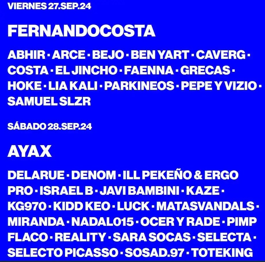 El sábado podremos encontrar artistas como Ayax, Denom, Israel B, Kaze, Kidd Keo, Ocer y Rade o Selecta, mezclando en el mismo recinto los mejores géneros musicales que suenan en todos lados.