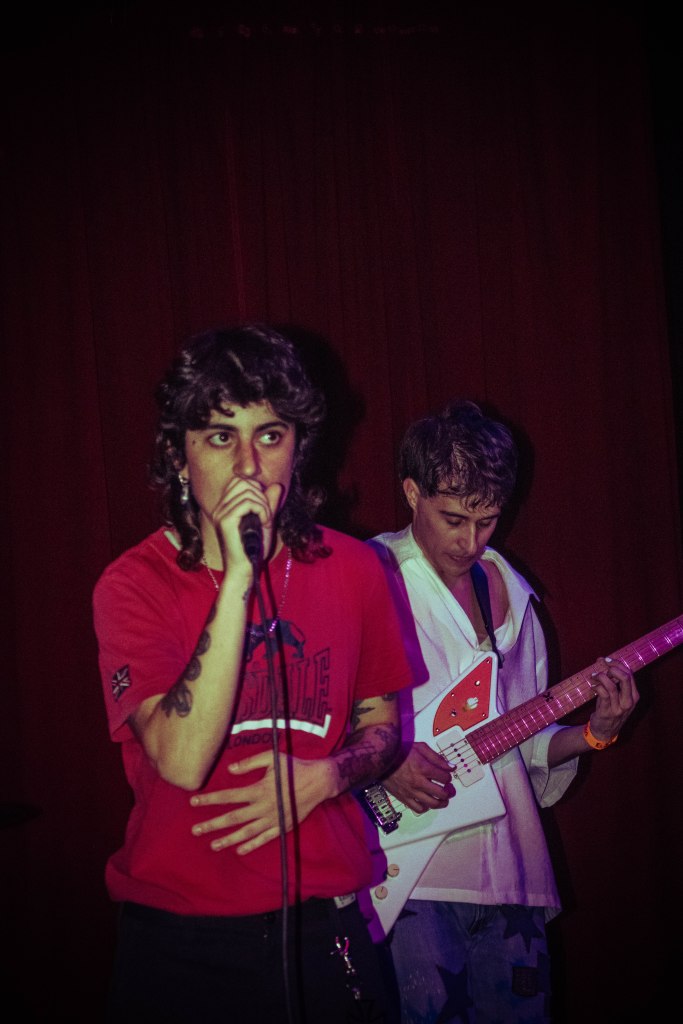 Durante «La escena«, quizás la canción más cañera de la banda, el público se unió aún con más fuerza al griterío y la proclama de la canción: «¿Tú que tienes que comentar? Si tu grupo es una mierda para pijos de ciudad / ¿Tú qué tienes para aportar? Si sonáis a señor indie que huele mal«. Sin bajar ni un tono, tocaron «(inserte_nombre)«, que como la propia banda aclaró, trata de un capullo de la industria musical, diciendo algo así como “Queríamos poner las iniciales pero por motivos legales decidimos dejarlo abierto, así que podría ser para cualquier imbécil”. Sonó en la sala alguna que otra ahogada reivindicación y se cruzaron miradas cómplices en relación al susodicho. No quedaba duda, el concierto estaba en el punto más alto. Tocaron entonces «Metro Ibiza«, su single de 2022, y su hermana del 2024 «Metro Goya«, ambas dedicadas (con mucho amor) al ‘pijo’ promedio de Madrid: «Yo es que no creo en las paguitas / Yo también tengo un amigo marica…».