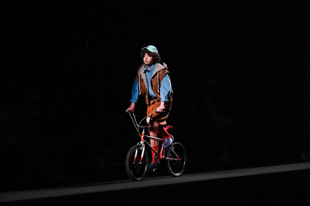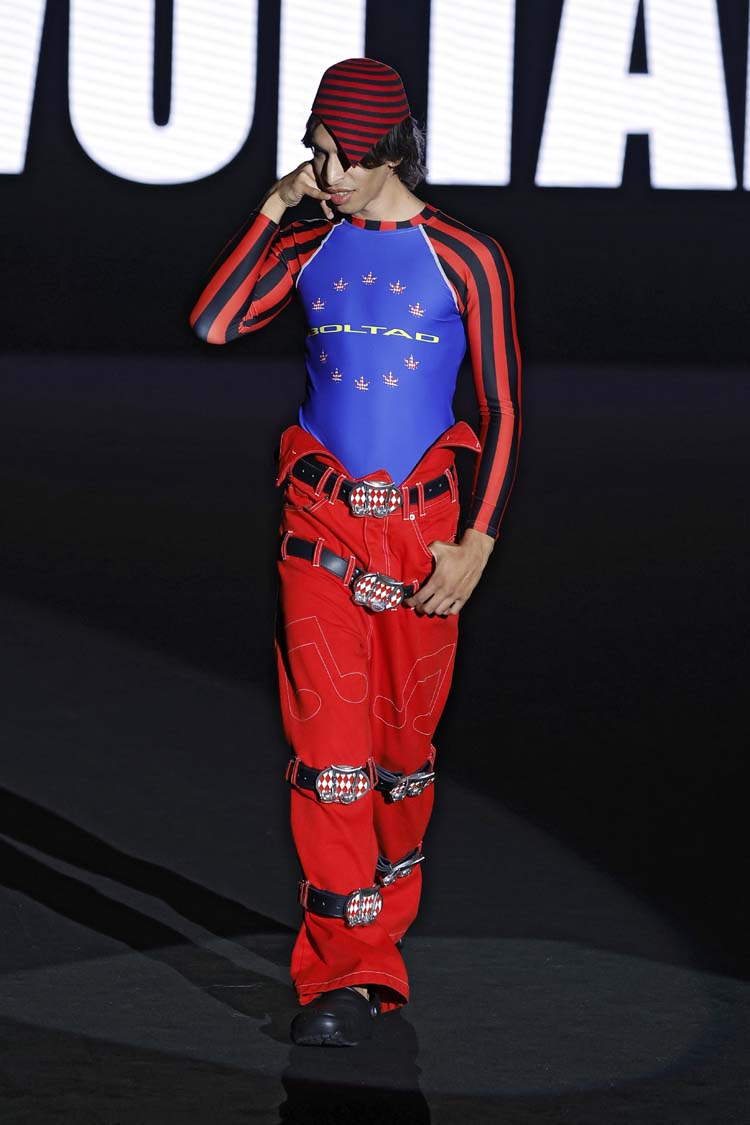 BOLTAD fue la primera marca en desfilar. Con su colección “WOLTAD”, el diseñador pacense quiso introducir a los espectadores en una nación imaginaria, donde la diversidad cultural toma especial relevancia y la expresión personal tienen un papel predominante. Los modelos no seguían un orden a la hora de desfilar, tan solo parecían divertirse y disfrutar de ese universo que Boltad había creado. Desde desfilar con hamburguesas en la mano, hasta salir en bicicleta. Esto desafió las normas de la pasarela tradicional y, definitivamente, la marca logró su objetivo: reflejar su identidad única. Durante toda la presentación no hubo una línea narrativa, los looks compartían formas geométricas, sin embargo, cada uno de ellos tenía elementos únicos. Aunque sí es cierto que optaron por colores más vívidos, estuvieron muy presentes los colores neutros y fríos que aportaban mayor diversidad. Además, transmitían esa necesidad de experimentación por los diversos estilos. Sin duda, el ánimo de exploración de la marca no dejó indiferente a ninguno de los presentes.