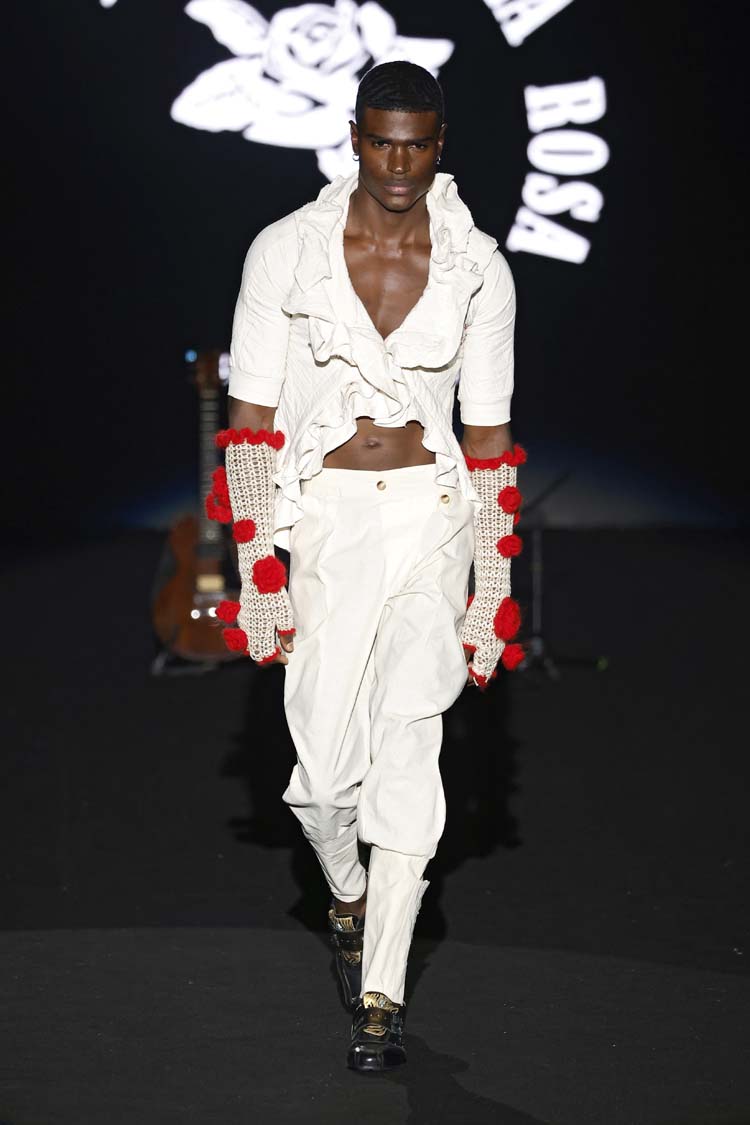 La siguiente firma en desfilar fue Arturo De la Rosa. Su propuesta “Hijos de la incertidumbre” comenzó con música en directo. La artista Diddy Stain introdujo con su guitarra la visión del diseñador y convirtió su propuesta en algo sencillo pero rompedor. La pasarela se inundó de siluetas con estructura y formas más definidas, donde estaban muy presentes la deconstrucción, la costura artesanal o el uso de tintes naturales. Malvas, verdes, blancos o negros fueron los colores que expresaron la ferocidad de la marca. Poco a poco, se irían introduciendo elementos con mayor detalle, como rosas que recorrían el cuerpo de las modelos o guantes con detalles florales que elevarían mucho más el look. La dedicación y emoción que el diseñador había puesto en cada una de las prendas era notable, pero no sería hasta el final de la presentación cuando todo ese esfuerzo se haría evidente. El creador de la firma salió a expresar su gratitud a la pasarela y, poco después, celebró el éxito de su presentación. Todo ello se mostró a través de un abrazo en el que se fundieron diseñador y modelos tras el cierre del desfile. De nuevo, Arturo De la Rosa presentaba una colección basada en el «power-wear«, donde toma importancia la confección de prendas teniendo en cuenta las necesidades específicas de cada cuerpo.
