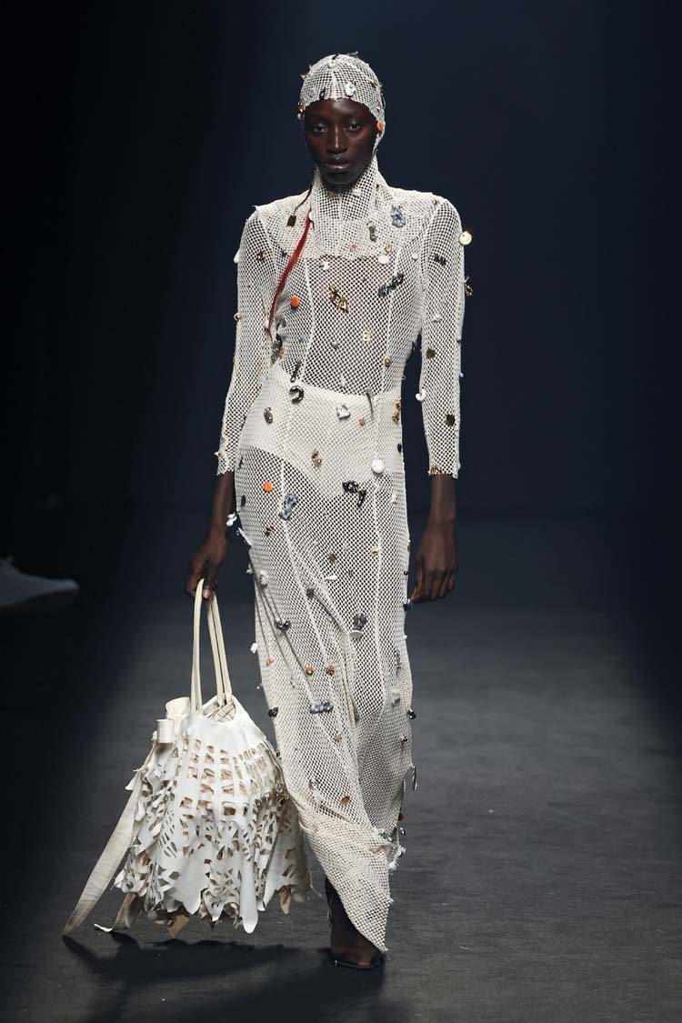 Tras concluir la propuesta de XVStrange, era el turno de H05, quien compartía franja horaria con la anterior. La propuesta bilbaína «Visita« comenzó eludiendo a un viaje en busca de recuerdos que nos ralentizan, es decir, la casa de la abuela de donde se intenta salir más lento de lo que se ha entrado. La colección giró entorno a objetos que se van acumulando en los cajones familiares, hilos o alfileres, entre otros. En definitiva, esta presentación se vivió como un retorno a los armarios de nuestras abuelas, donde descubrimos prendas que nos acompañarán para siempre. No todo quedó ahí, sino que hubo aspectos muy sorprendentes de la propuesta como los llamativos complementos. Amplios bolsos confeccionados a partir de materiales recolectados, que evocaban instantáneamente la nostalgia de un espacio familiar, mientras que otros elementos simulaban rostros humanos, y añadían un toque inesperado y creativo a la colección, transportando al espectador al propio surrealismo.