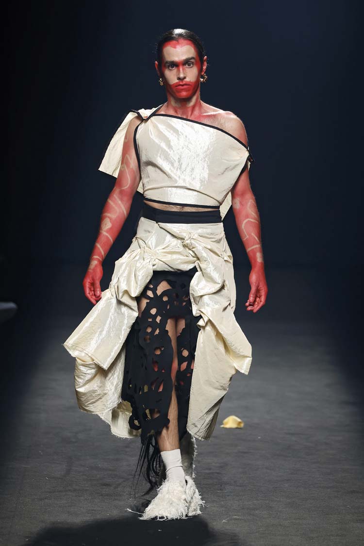 Era el turno de la marca XVStrange, una de las propuestas más desconcertantes de la tarde, pues tanto los visuales como la puesta en escena dejaron boquiabiertos al público. El mensaje inicial de su colección «Mowande» partía de una frase: «estamos acostumbrados a escribir la moda como algo lejano a nosotros, pero en verdad es como lo más escénico«. A través de esto, se explica el viaje del artista hacia la creación, explorando la búsqueda de una conexión profunda con la fuente de inspiración y la creatividad interna. El inicio del desfile marcaría la dirección de la colección, un juego de arte callejero, como el grafiti y la pintura abstracta. Las prendas se habían convertido en lienzos humanos, donde se daba rienda suelta a la creatividad. El resultado de esto fue una propuesta mixta compuesta por 9 looks masculinos y 6 femeninos. En la pasarela se veían pantalones, camisetas, chaquetas, faldas y vestidos, donde cada prenda contaba parte del proceso artístico, desde la idea hasta la materialización de la obra.