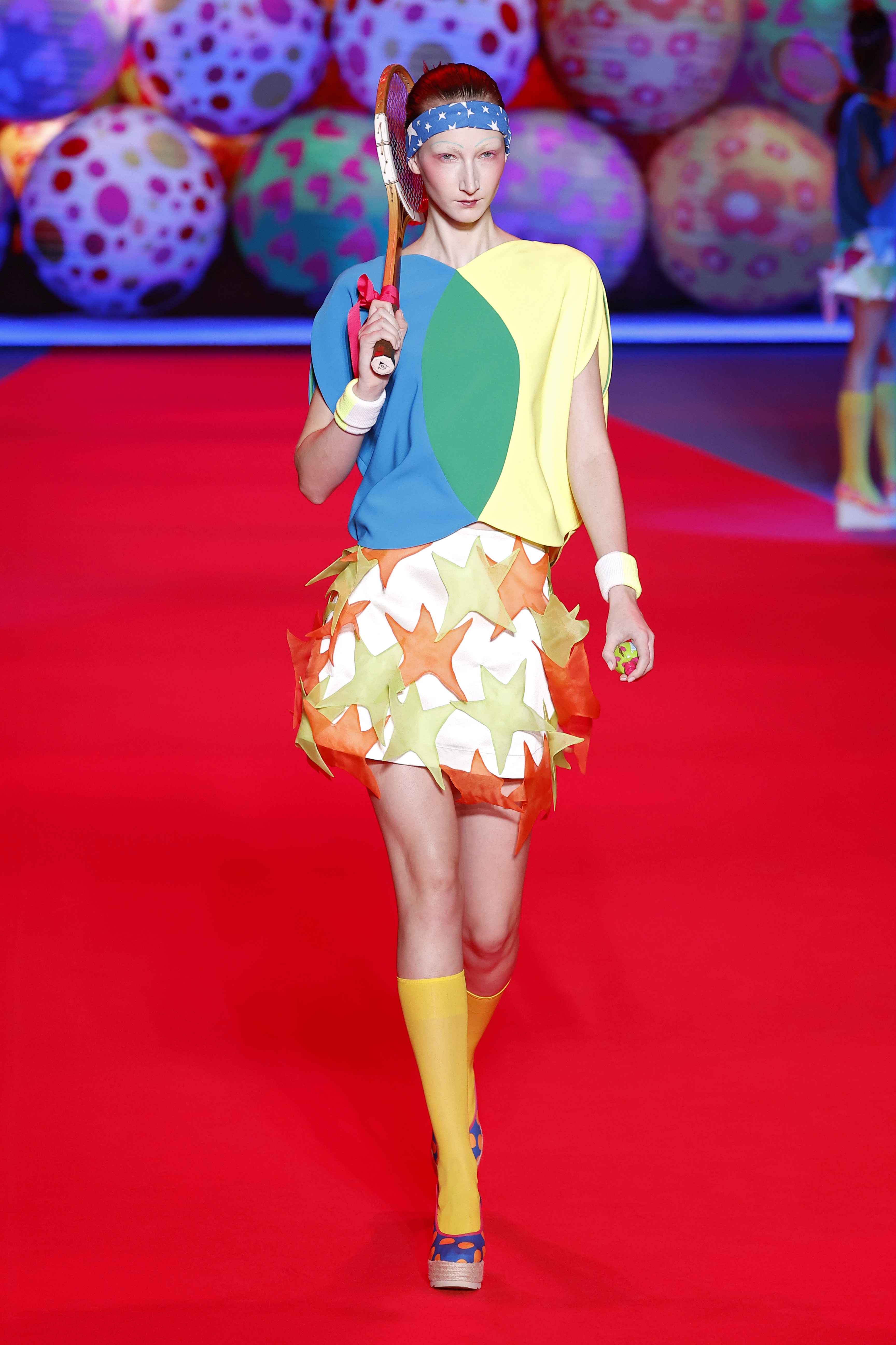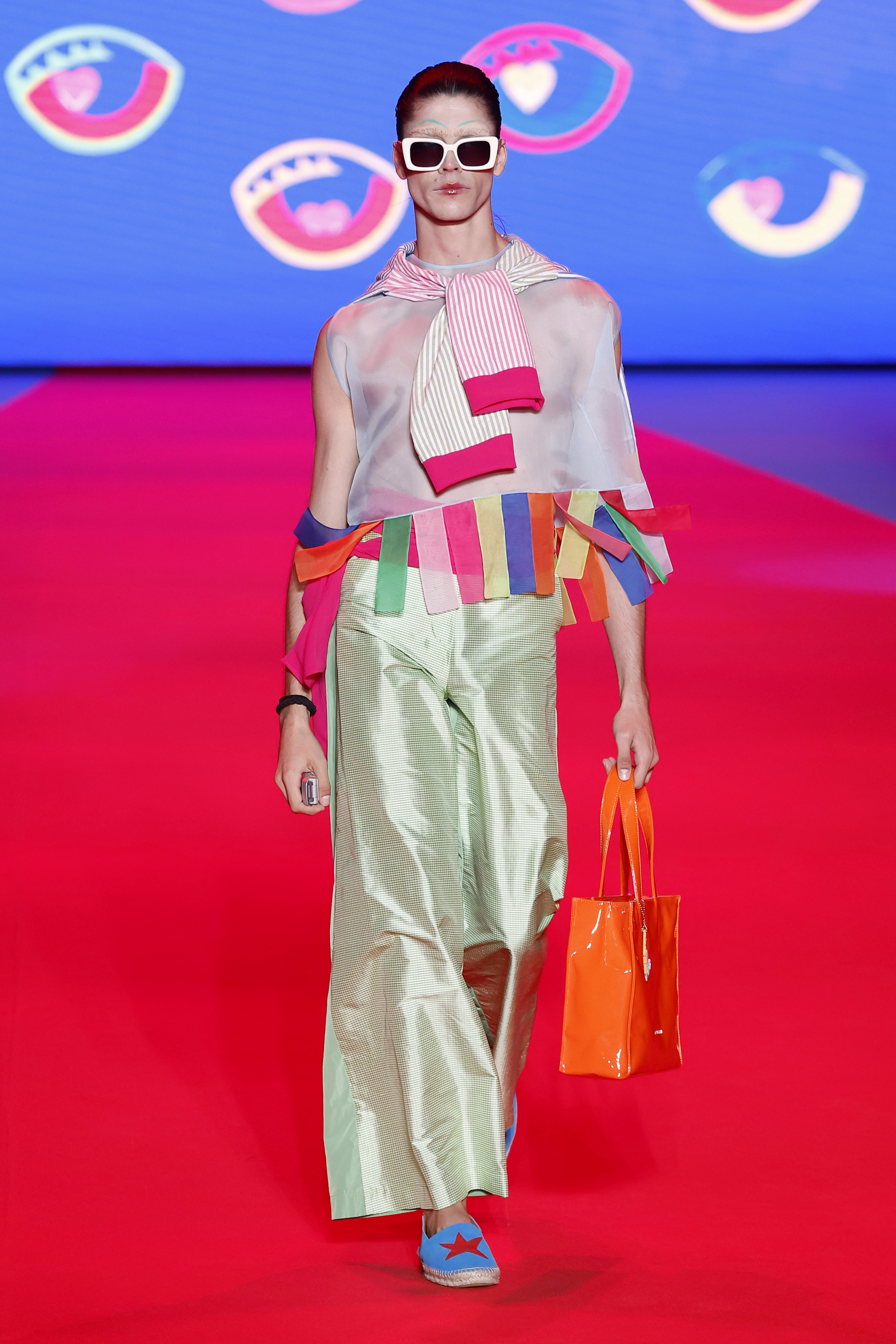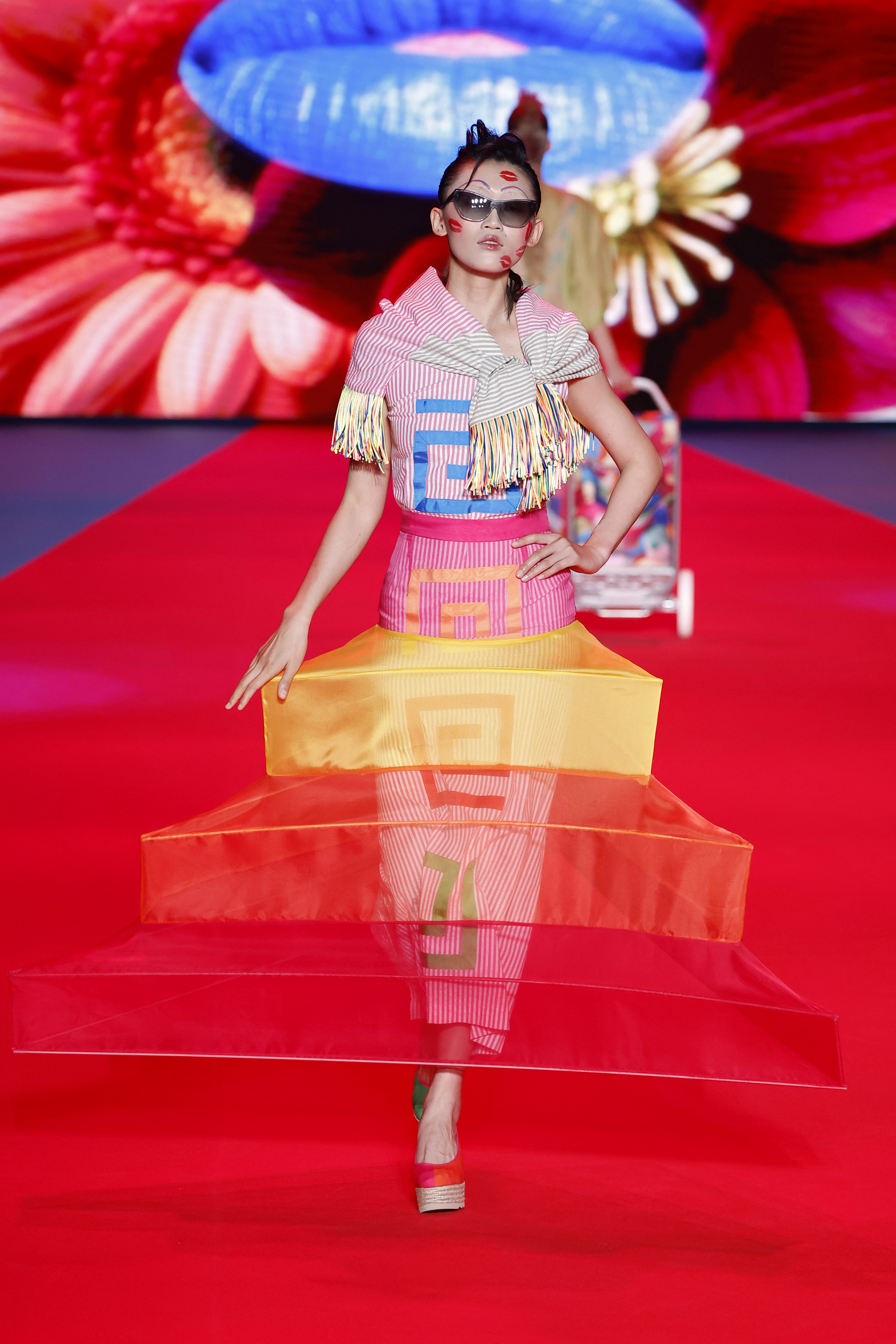 La pasarela se transformó, gracias a la colaboración del talentoso Carlos Marán, quien aportó su visión artística junto a Javier Carrera Acosta. Ambos crearon un espectáculo en el que jardineros, payasos y glamourosas divas desfilaron con atuendos llenos de organzas transparentes, cintas de colores y creativas formas geométricas.