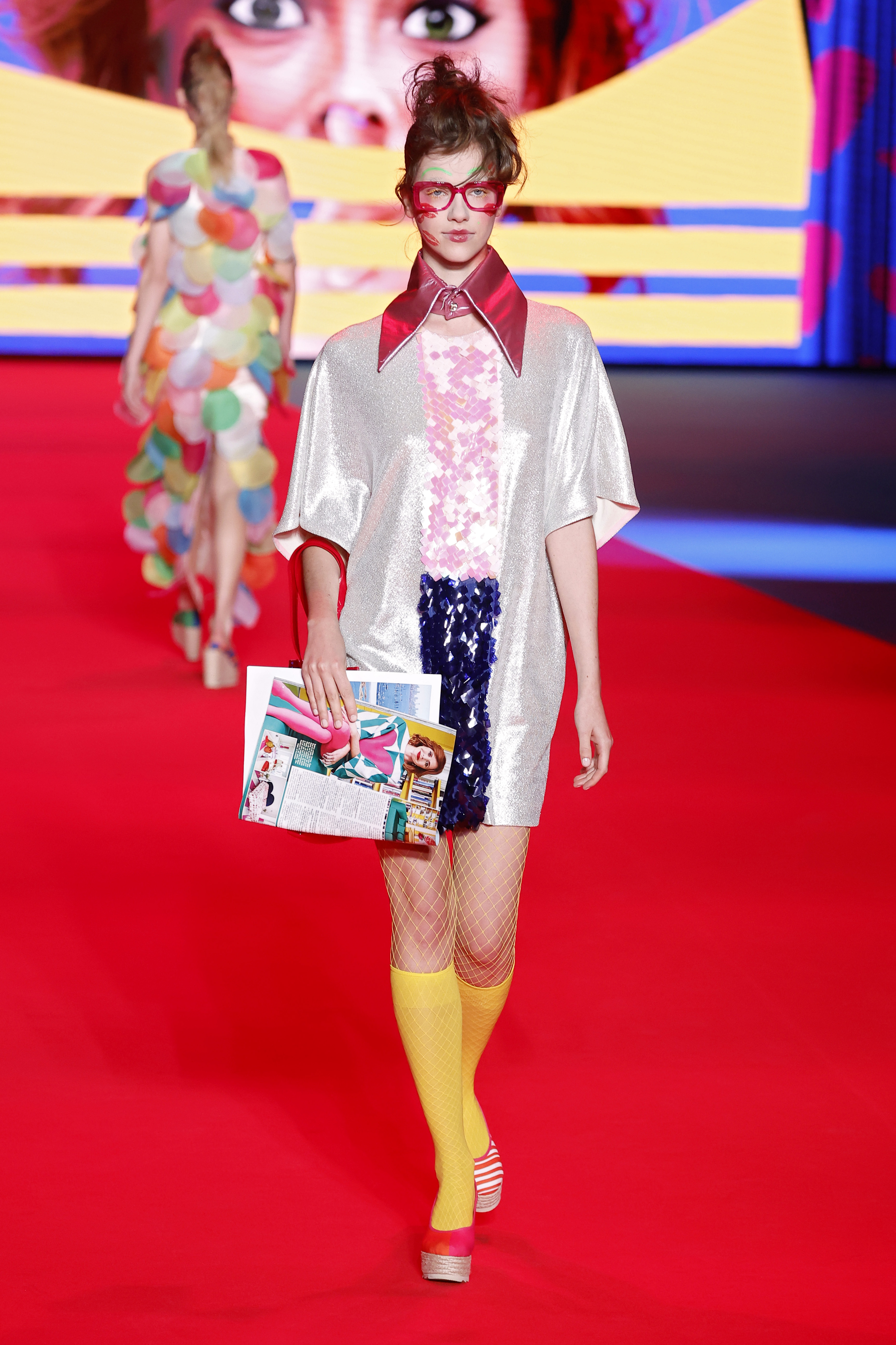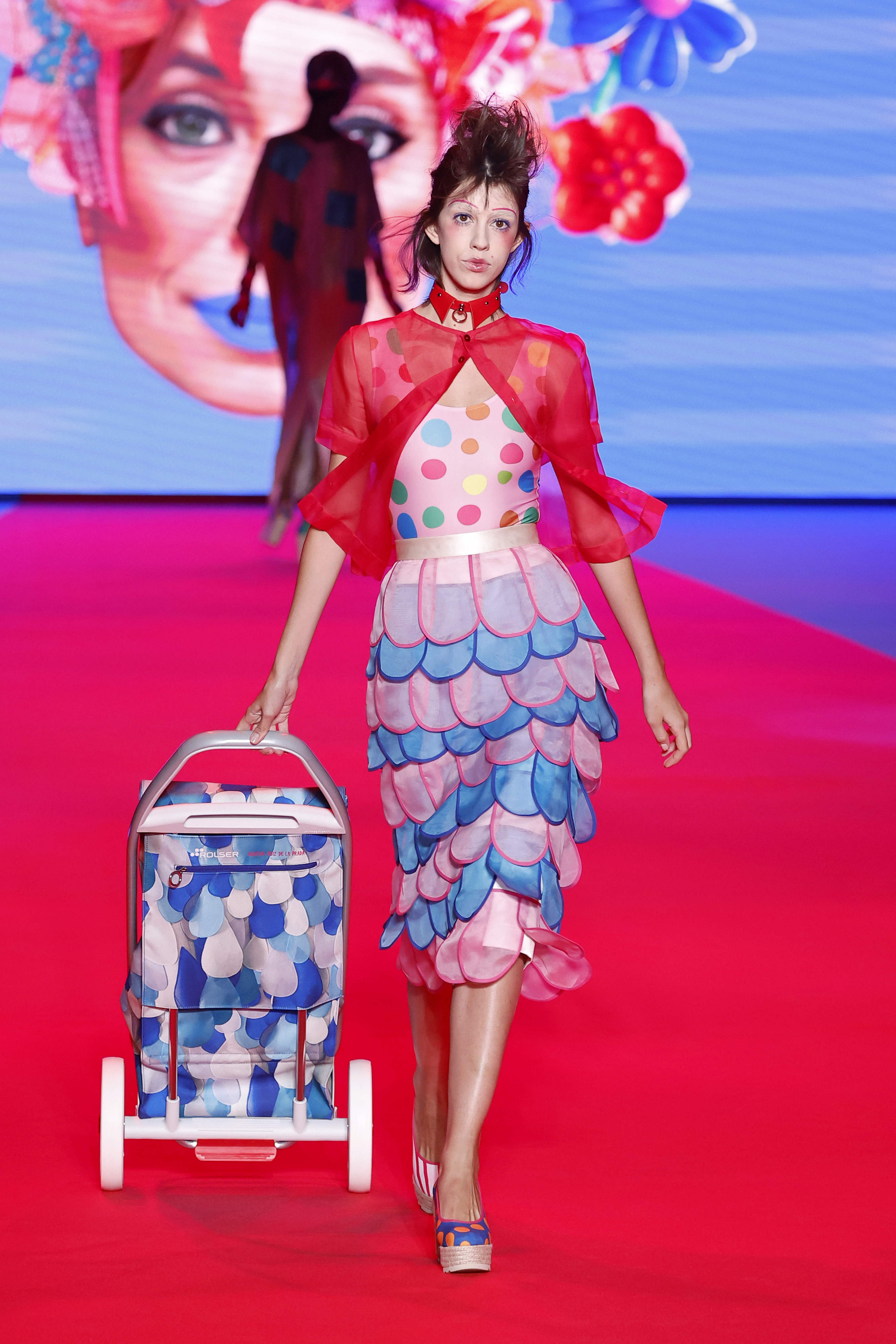 Además, la experiencia se enriqueció con la interacción del público gracias a los perfumes de Ágatha y llamativos complementos como las alpargatas de Picón y los carritos de compra, de los que las modelos sacaron objetos e incluso una piña, haciendo referencia a la nueva manera de ligar en el Mercadona. Todo esto bajo la mirada atenta del avatar digital de Ágatha, que vigilaba el desfile desde las pantallas, asegurándose de que su esencia estuviera presente en cada costura.