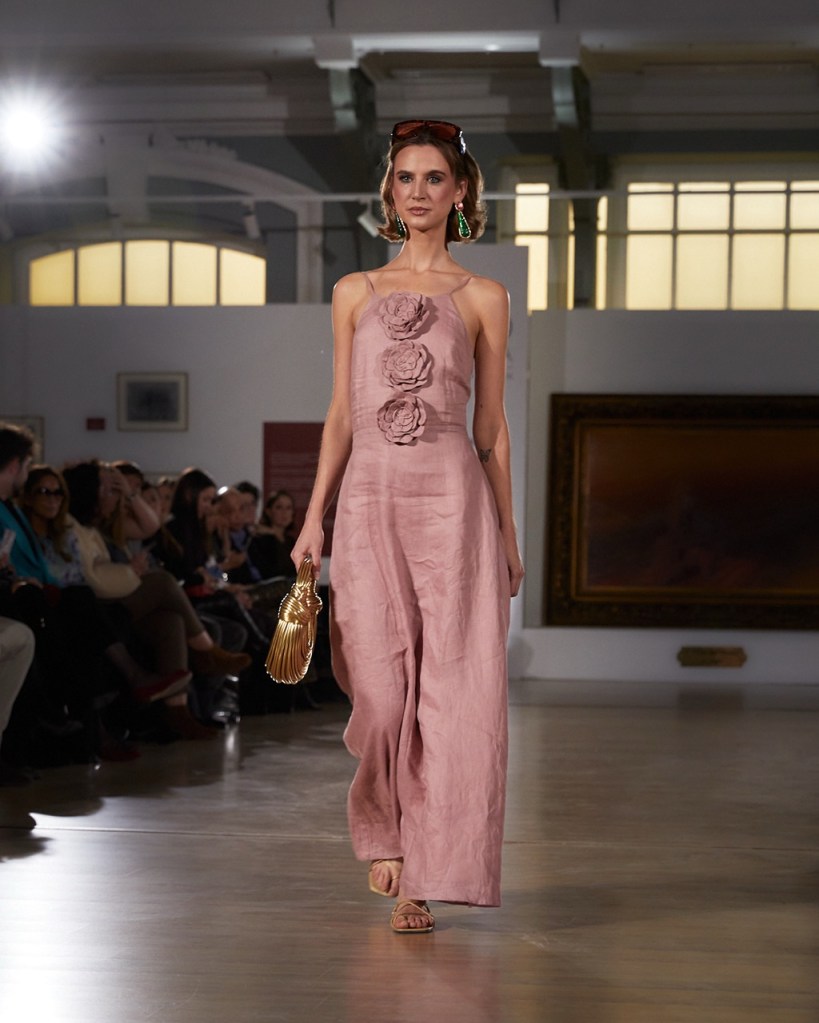 La diseñadora colombiana Faride abrió este segundo bloque del día con una propuesta delicada y serena. Una sucesión de prendas que evocaban el sol y la calma del verano. Su colección destacaba por una construcción de telas ligeras que se movían entre colores pastel, marrones y azules. Por otro lado, los detalles metálicos de los bolsos y sandalias complementaban a la perfección el aire relajado de los looks. Las modelos con sus recogidos y maquillaje trasmitieron naturalidad y elegancia. El desfile fue coronado con un cierre poético cuando las modelos salieron juntas sujetando claveles que más tarde entregaron al público.