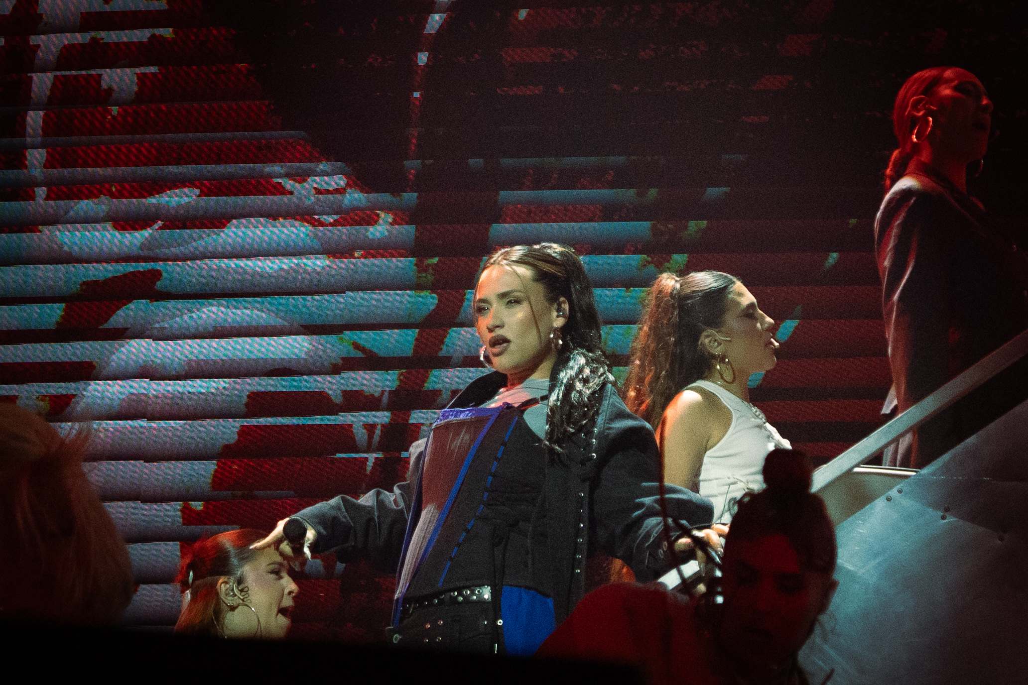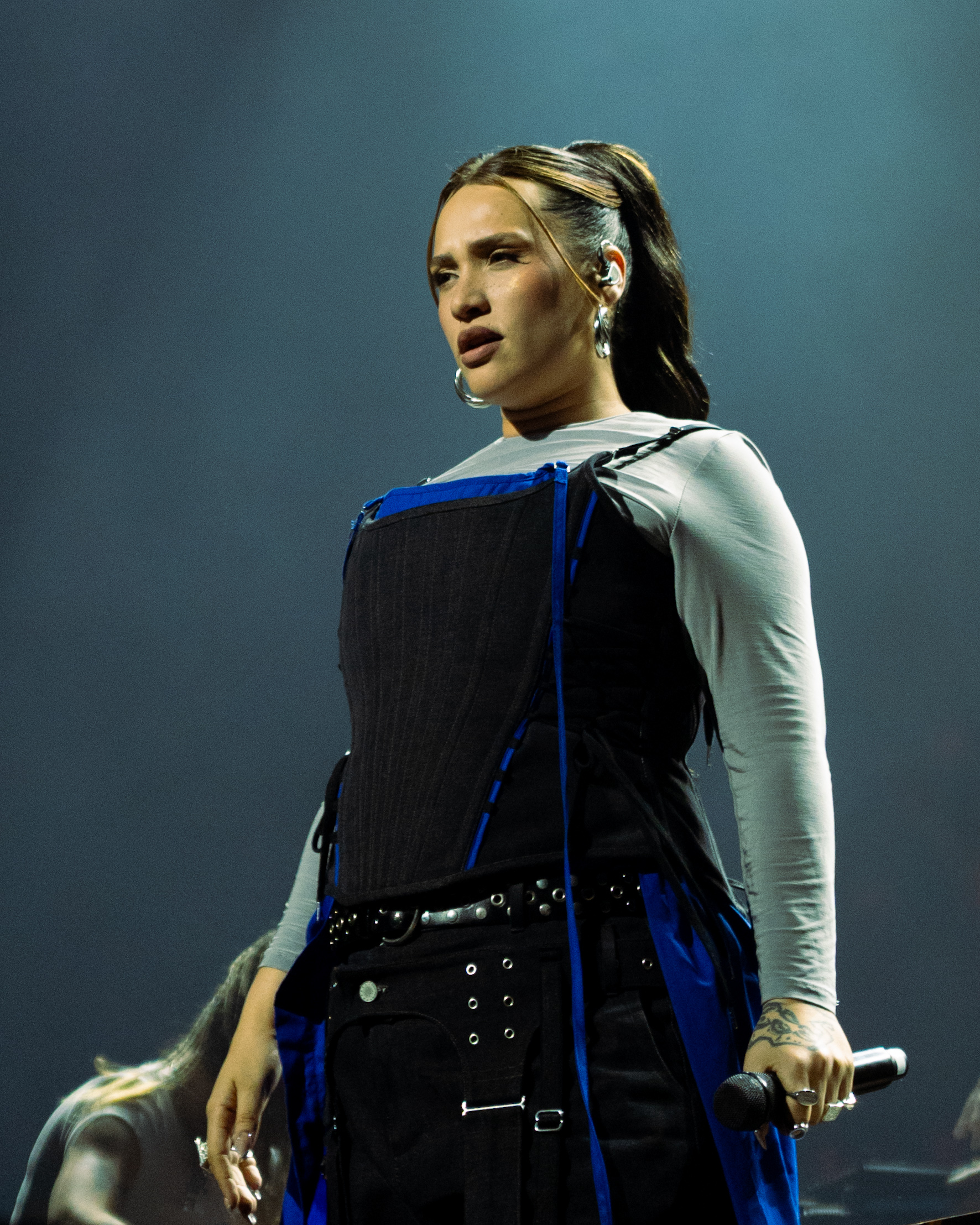 Cuando las luces se apagaron y cientos de móviles se alzaron en la pista como luciérnagas dispuestas para grabar, el estadio entero supo que algo grande estaba a punto de ocurrir. La cantante apareció vestida de negro, con un corsé ajustado y una prenda azul Klein que recordaba a la portada de Kaelis, su nuevo disco. Estaba guapísima, y no solo por su estilismo, sino por la seguridad con la que pisaba el escenario. Había en ella una determinación clara, como si supiera con exactitud a qué había venido.
